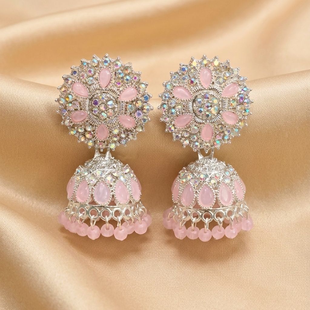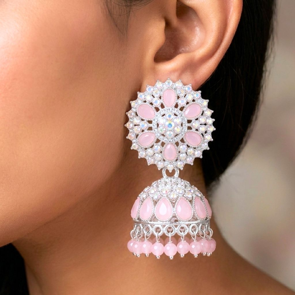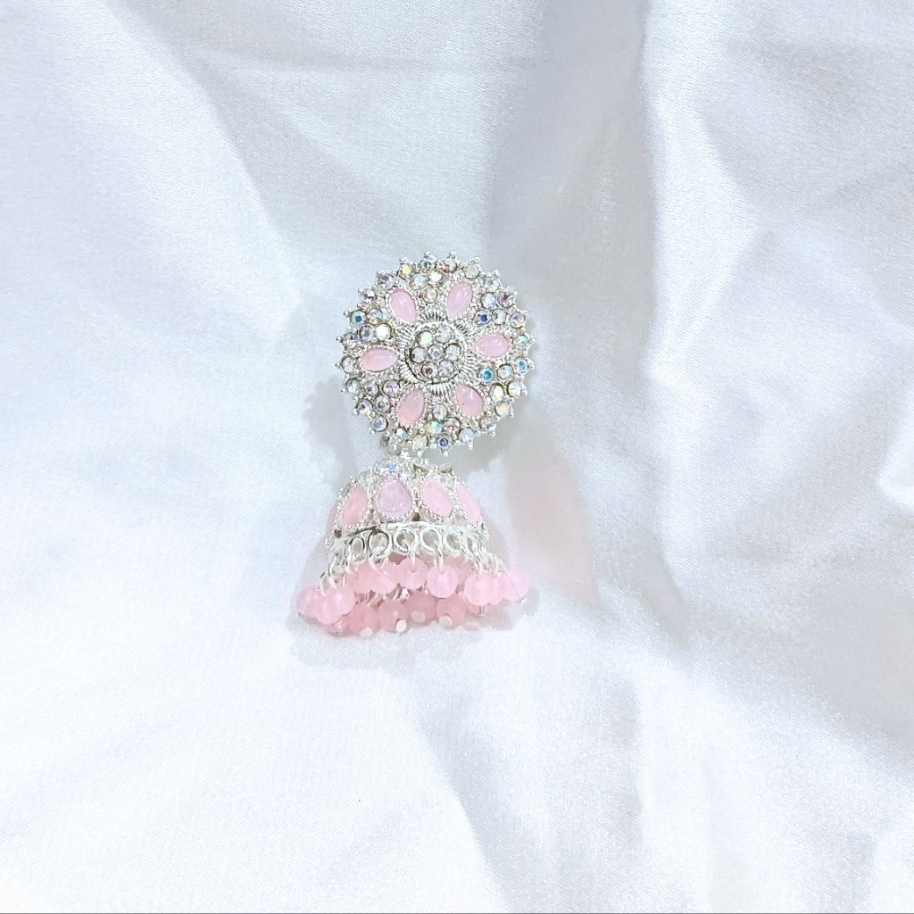 A dreamy pair of baby pink jhumkis that blend traditional charm with a fresh, modern palette. These are perfect for when you want that classic desi look but with a soft, feminine touch.