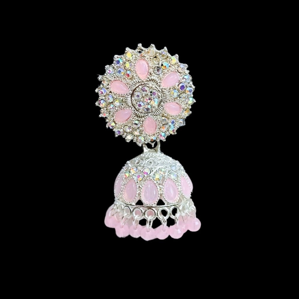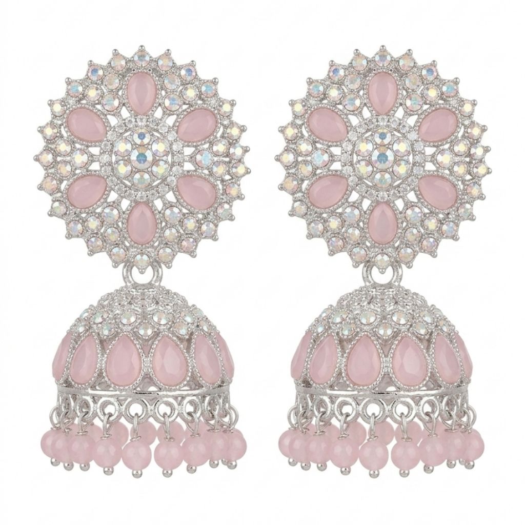 There’s something so timeless about a jhumki, and this pair in baby pink is just lovely. The top features a round, floral-inspired stud filled with soft pink stones and a hint of shimmer, while the bell itself is decorated with teardrop-shaped accents. To finish it off, we’ve added delicate pink beads at the bottom that move beautifully when you walk.