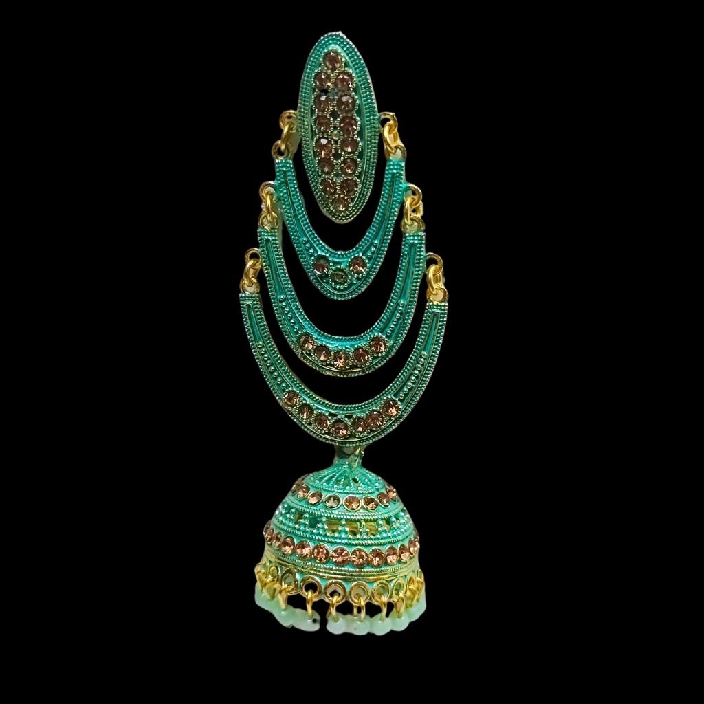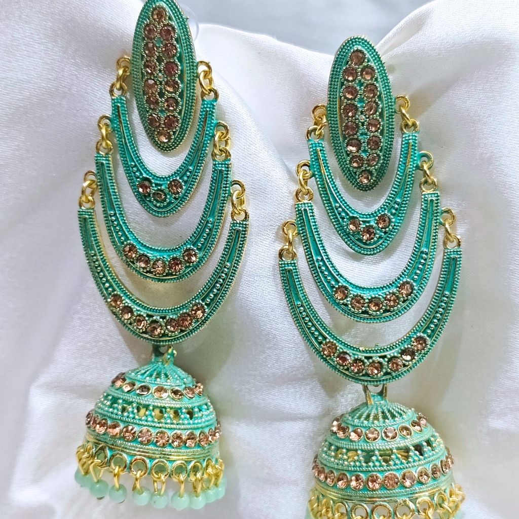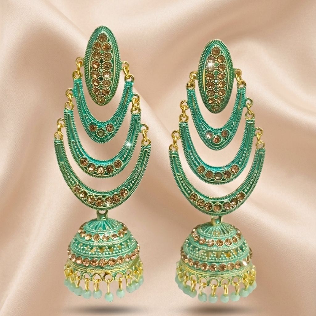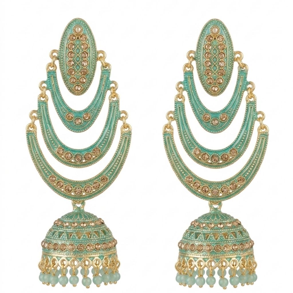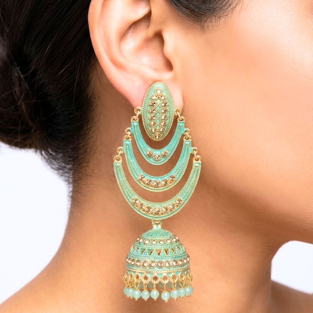 These earrings are a total standout because of their gorgeous green colour. We’ve designed them with three layered crescents that flow down into a classic jhumka bell, all finished with tiny, matching green beads at the bottom. The gold-toned detailing against the green gives them a very rich, traditional look without feeling too heavy.