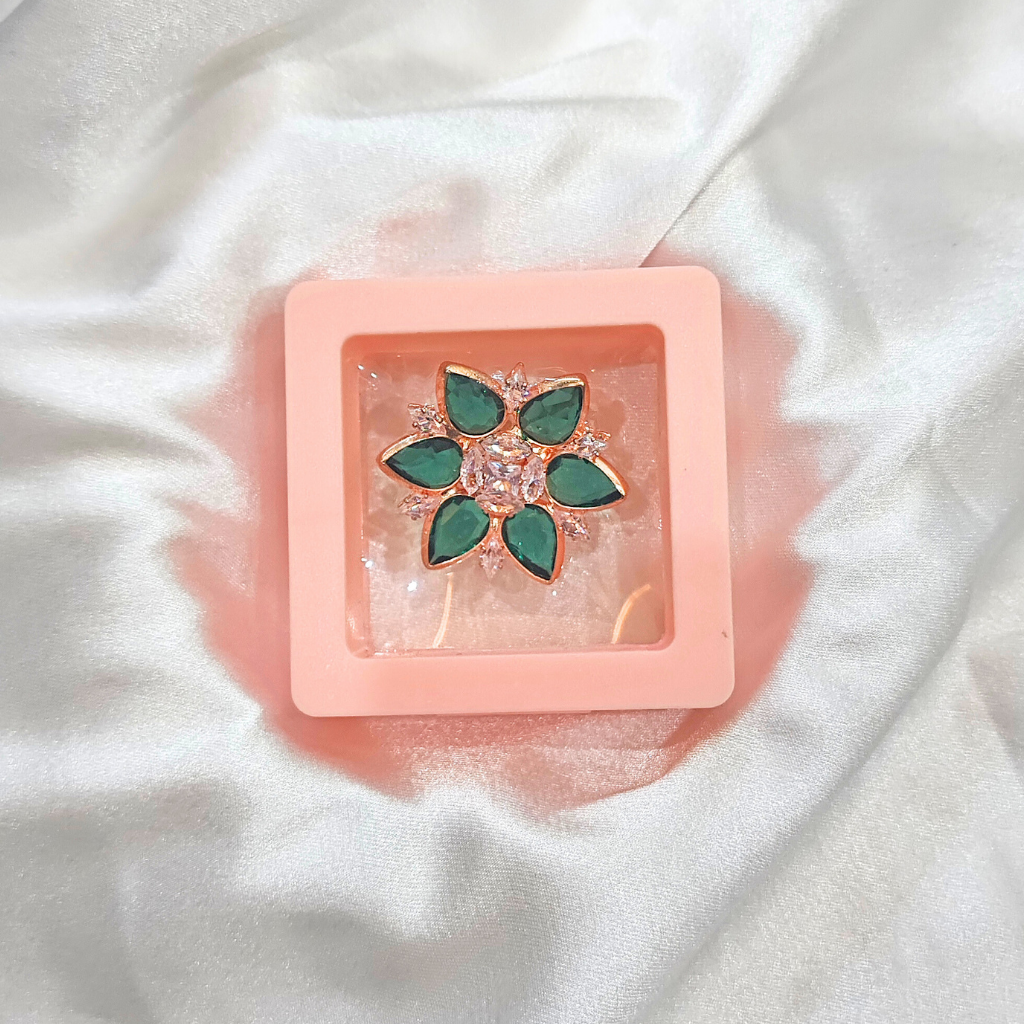 Buy It NowThis CUBIC ZIRCONIA RING in a deep, dark green color has a pretty flower shape. It’s a simple and elegant ring that adds a bit of nature-inspired beauty to your look.