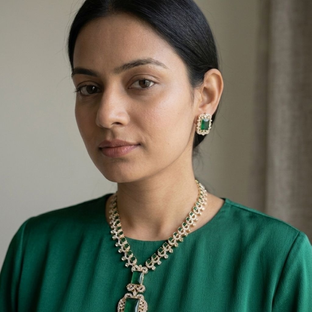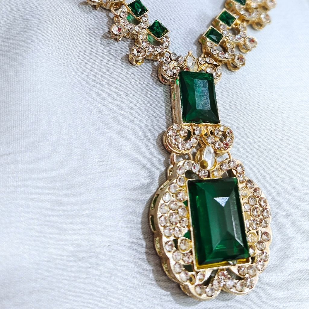 A rich green statement necklace set with a traditional touch. Perfect for weddings and festive occasions when you want something bold yet elegant.