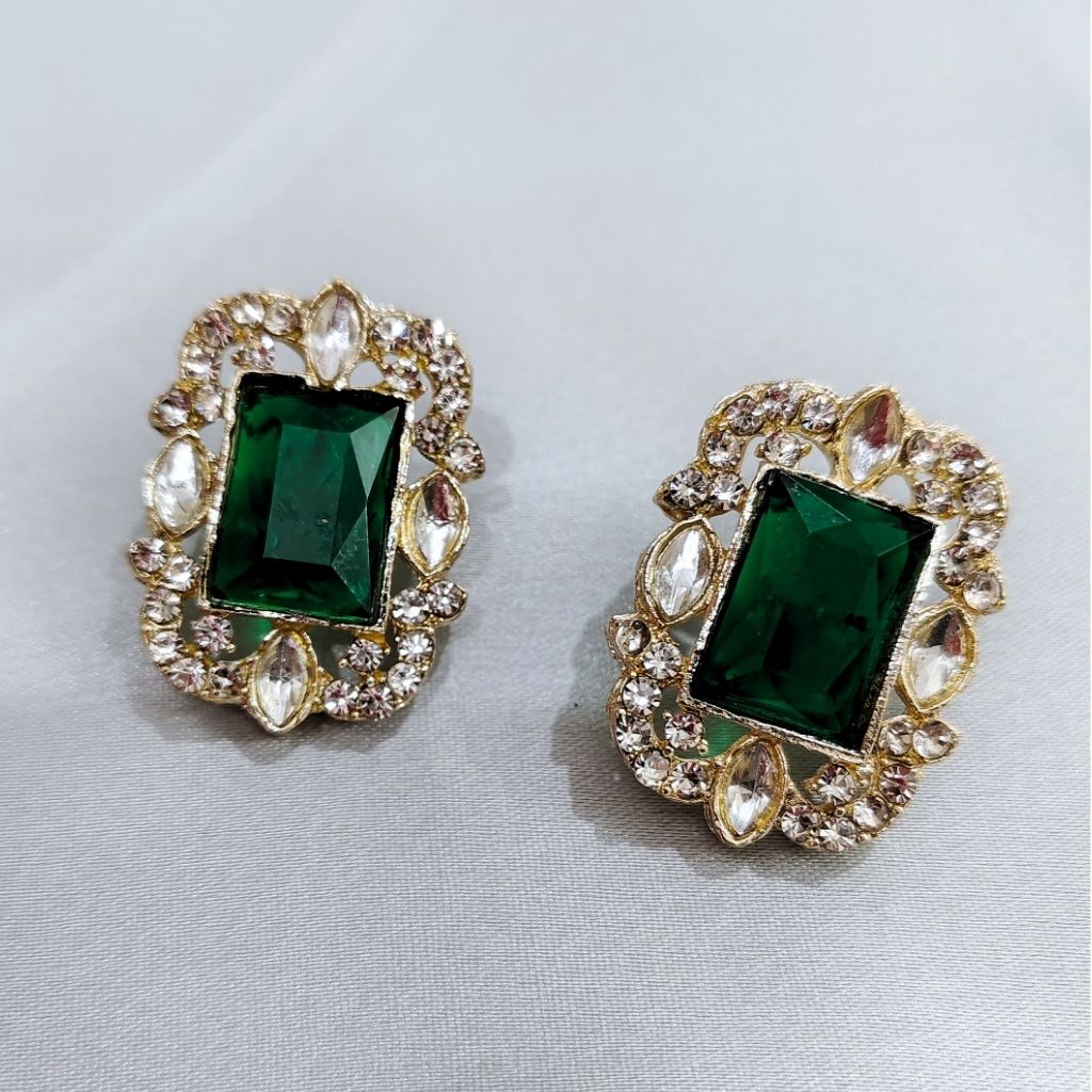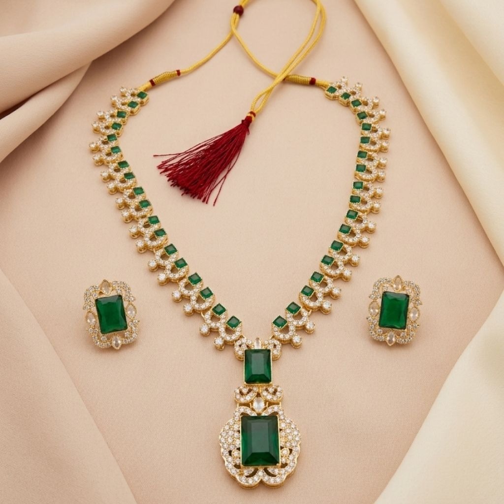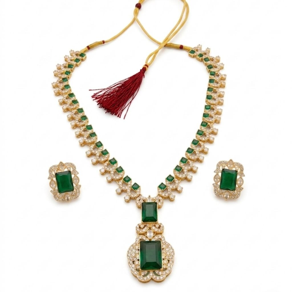 This green stone necklace set has a rich and elegant look that feels perfect for special occasions. The design features deep green rectangular stones placed beautifully along the chain, giving it a royal and eye-catching appeal.