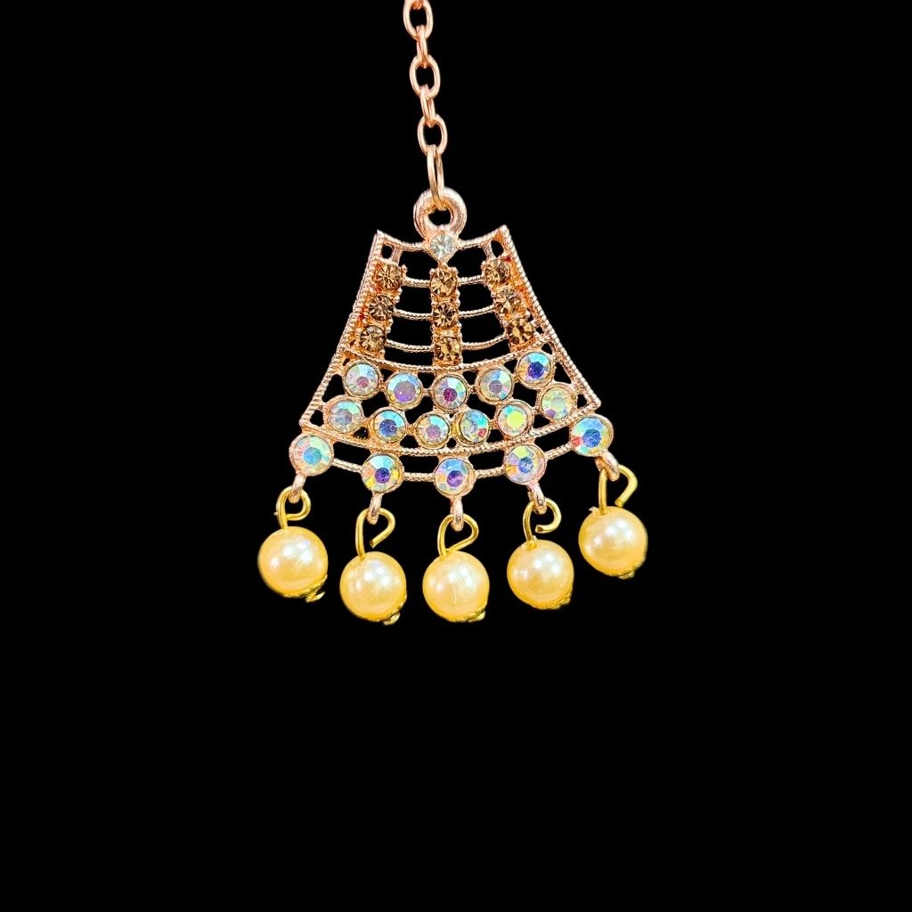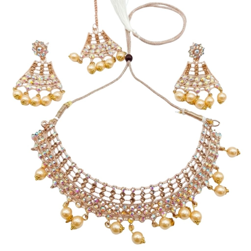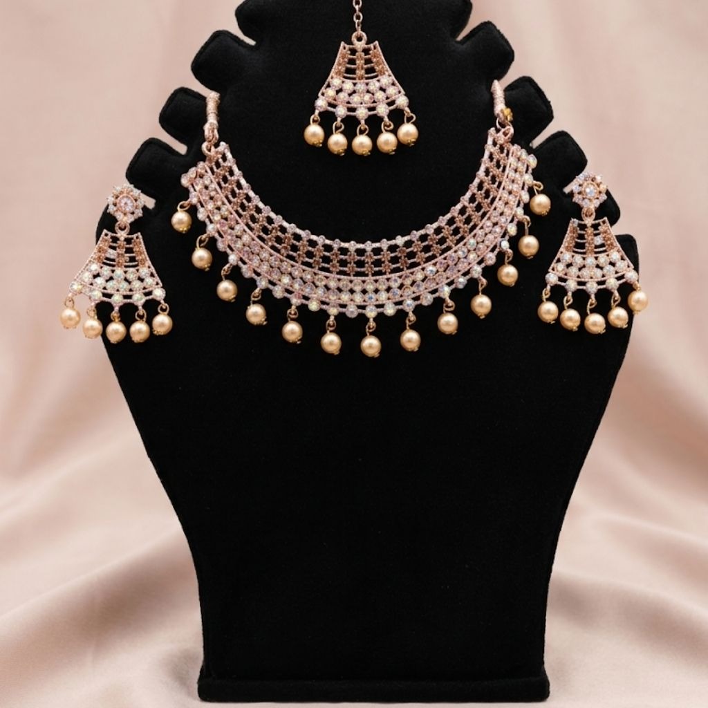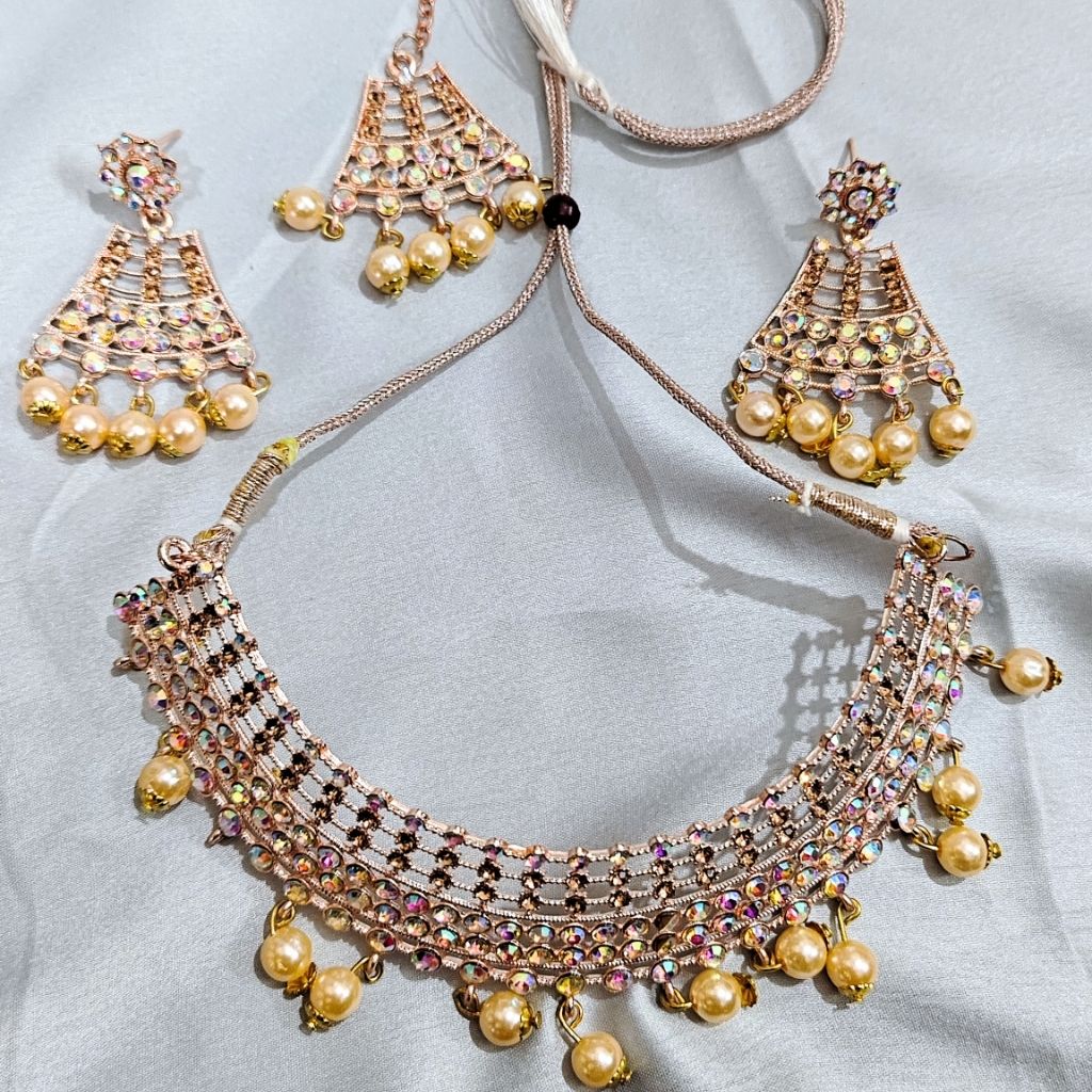 A delicate gold-toned choker with soft sparkle and pearl drops. Perfect for festive wear when you want something light yet eye-catching.