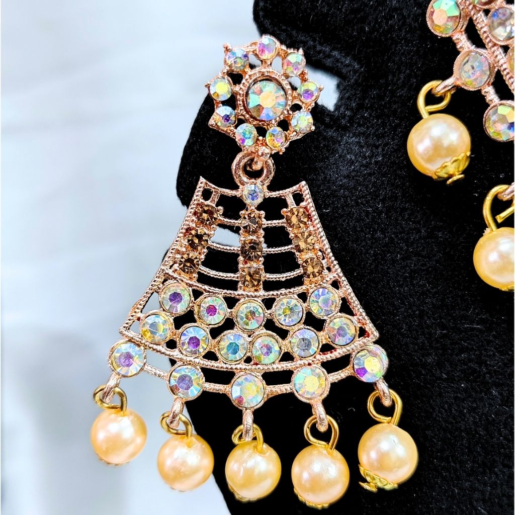 This necklace set comes with a beautifully detailed choker design, featuring fine stone work that gives off a subtle multi-colour shine. The pearl drops at the bottom add a soft, traditional touch, making it feel elegant without being too heavy.