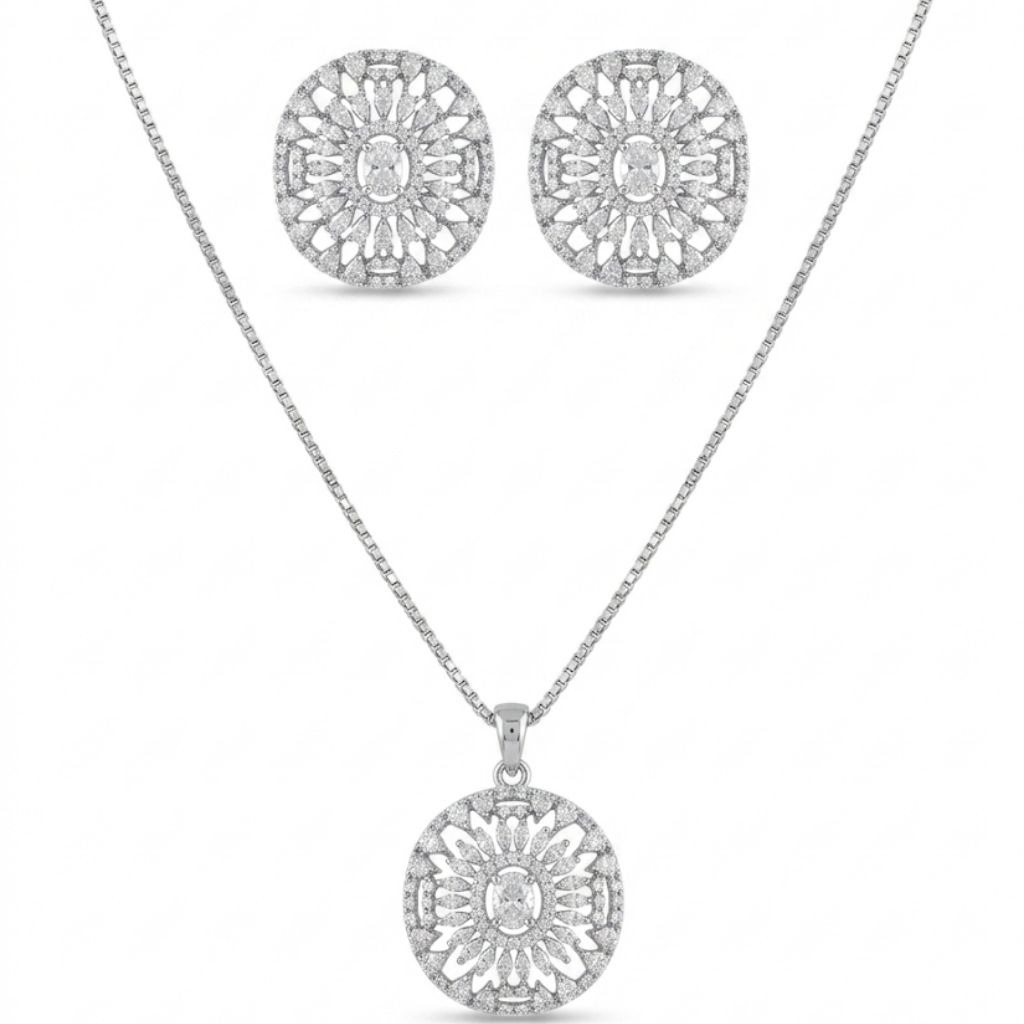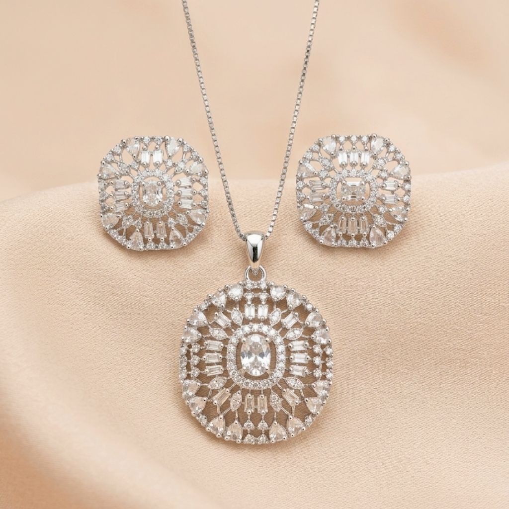 This set is all about intricate detail and maximum sparkle. The circular pendant and matching earrings feature a beautiful, open-work sunburst pattern that’s fully studded with fine white crystals. It has a very regal, “diamond-look” finish that catches the light from every single angle.