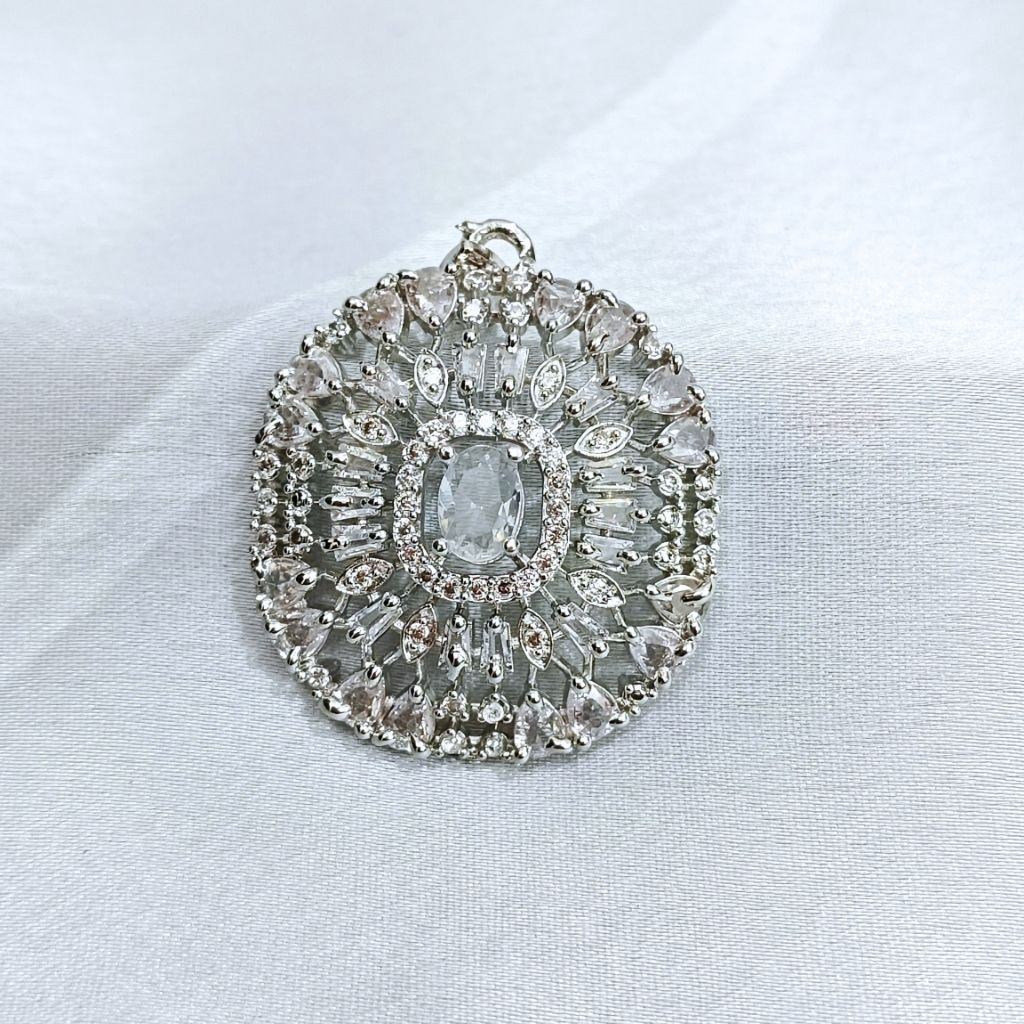 A breathtaking silver-toned pendant set with a detailed floral mandala design. Covered in shimmering white stones, it’s a brilliant choice for when you want a high-shine, luxury look.